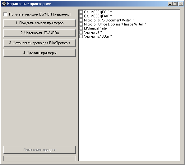 PrnSecu. Управление принтерами (смена владельца, установка прав, удаление). Программа управления принтерами. Делалась для терминального сервера в связи с тем, что спулер часто падал, и в итоге мапированных принтеров стало более 1000. Для ручного удаления необходимо сначала сменить владельца, затем дать права на управление принтерами группе PrintOperators, и только после этого доступно удаление принтеров. В этой программке весь процесс автоматизирован.